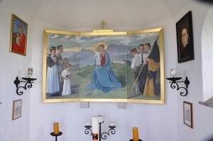 Der Innenraum ist mit mehreren Bildern, Kerzen und Blumenschmuck ausgestattet. Das große mittige Bild ist ein Gemälde der Salzburger Malerin Chr. Poeschl. Es zeigt mittig Maria mit dem Jesuskind vor der Stoißer Alm auf dem Teisenberg. Im linken Teil steht und kniet eine betende Familie und im rechten Teil stehen drei Mitglieder des Kolpingvereins mit ihrer Fahne. An der linken Wand findet ein weiteres Bild von Maria mit dem Jesuskind und an der rechten Wand hängt ein Bild des Priesters Adolph Kolping (1813–1865), dem Begründer des Kolpingwerks.